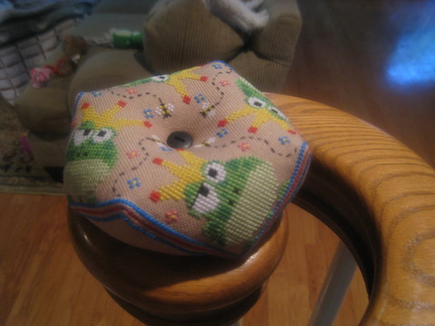This is the biscornu I got from Jenn in an exchange. It is huge and has these cutest little frog princes on them ie: The Frog & the Princess. I just love it. It is a Barbara Ana Designs called